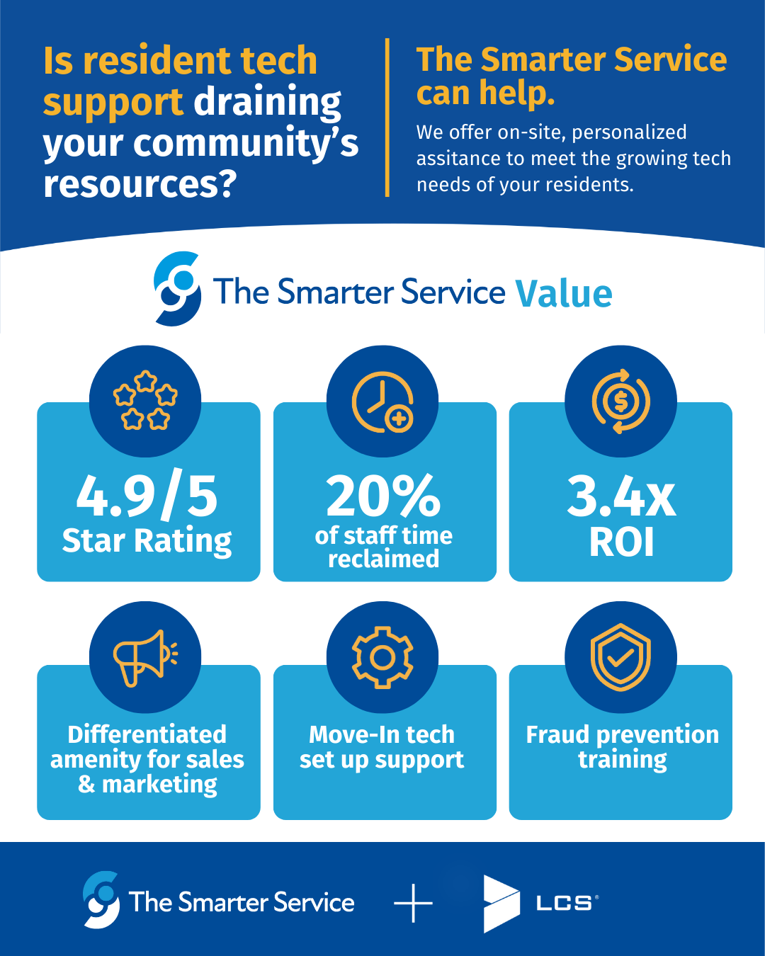 Technology questions pull staff away from their primary role and create hidden operational strain. The Smarter Service on-site Tech Concierges handle resident tech issues, education, and troubleshooting allowing community staff to stay focused on care, operations, and engagement. Communities consistently see meaningful staff time reclaimed (20%+) without increasing payroll.